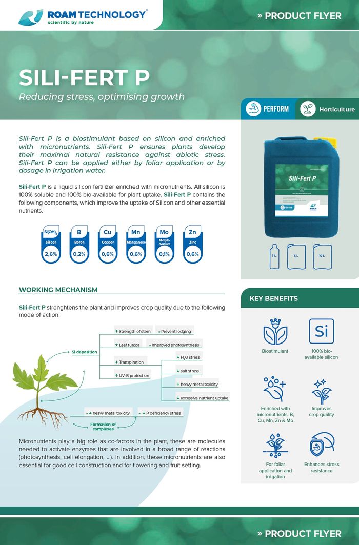 Sili-Fert P is a biostimulant based on silicon and enriched with micronutrients. The product ensures plants develop their maximal natural resistance against abiotic stress. Sili-Fert P can be applied either by foliar application or by